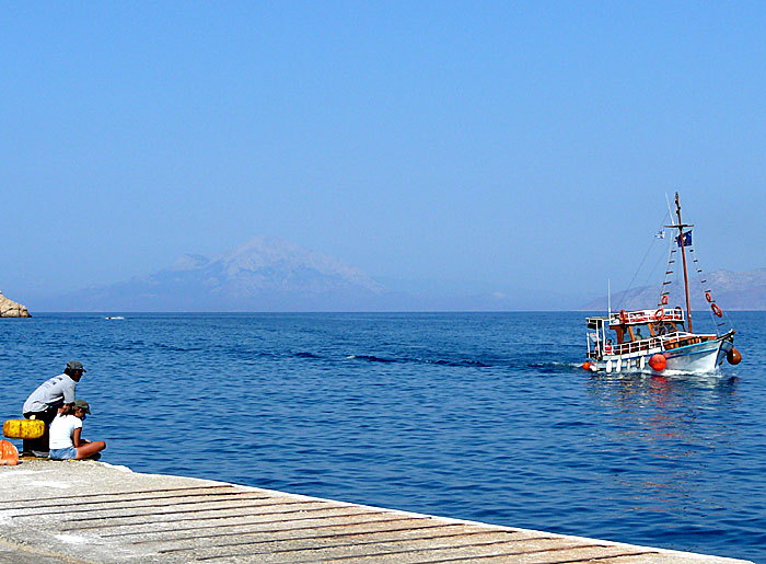 Ena sekunden är jag bombsäker på att det är bad- och utflyktsbåten med ena brodern som väl heter Yiannis - och här är vi på väg från Psili Ammos till Pythagorion på Samos. Tycker mig känna igen det höga turkiska berget till vänster.
